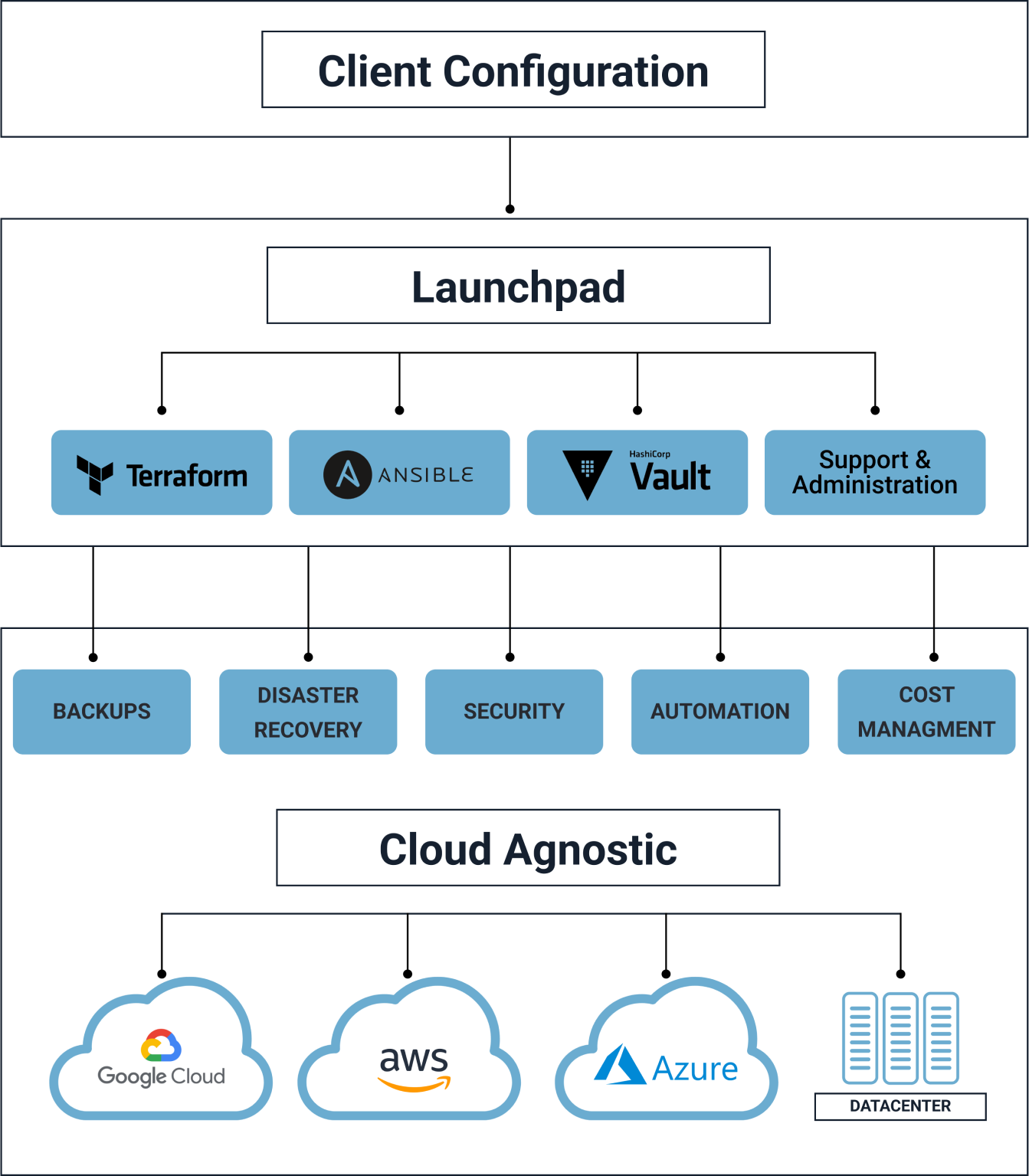 Cloud Launchpad is an automated deployment solution to help businesses quickly and easily launch, iterate, and scale their cloudnative applications. It provides a range of tools and services to help create and manage cloud infrastructure. We are not only cloud agnostic; we are tools agnostic as well. We provide value rather than tools or technology to our customers.